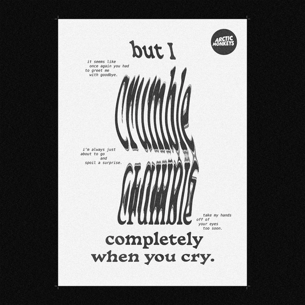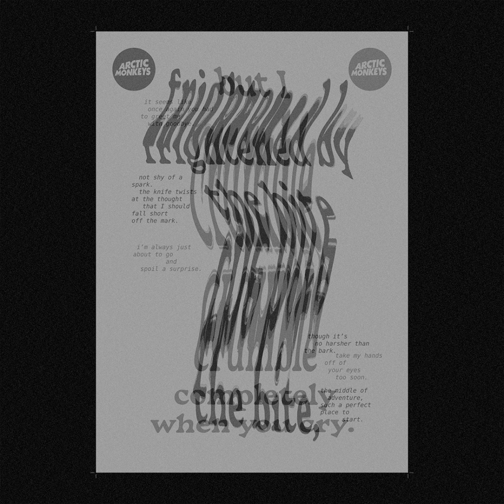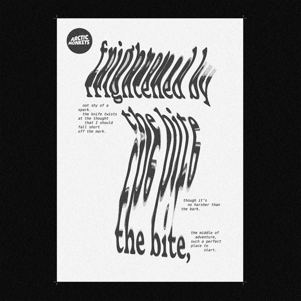 Graphisme 505 juin 2022réalisation d’un poster sur la chanson 505 de Arctic Monkeys ✦ manipulation typographique de deux couplets au scanner puis mise en page en superposition et impression sur calque 90g29,7x42cm logo 3D mai 2021premier essai de modélisation 3D sur blender, réalisation d’un logo métallisé à partir d’une typographie dessinée à la main ✦ animation de rotation du logo ✦ redesign orangina avril 2021exercice personnel d’entraînement à la création d’identités visuelleset au changement de registre d’univers graphique d’une marque ✦ différentes recherches logo final design de l’étiquette de canette